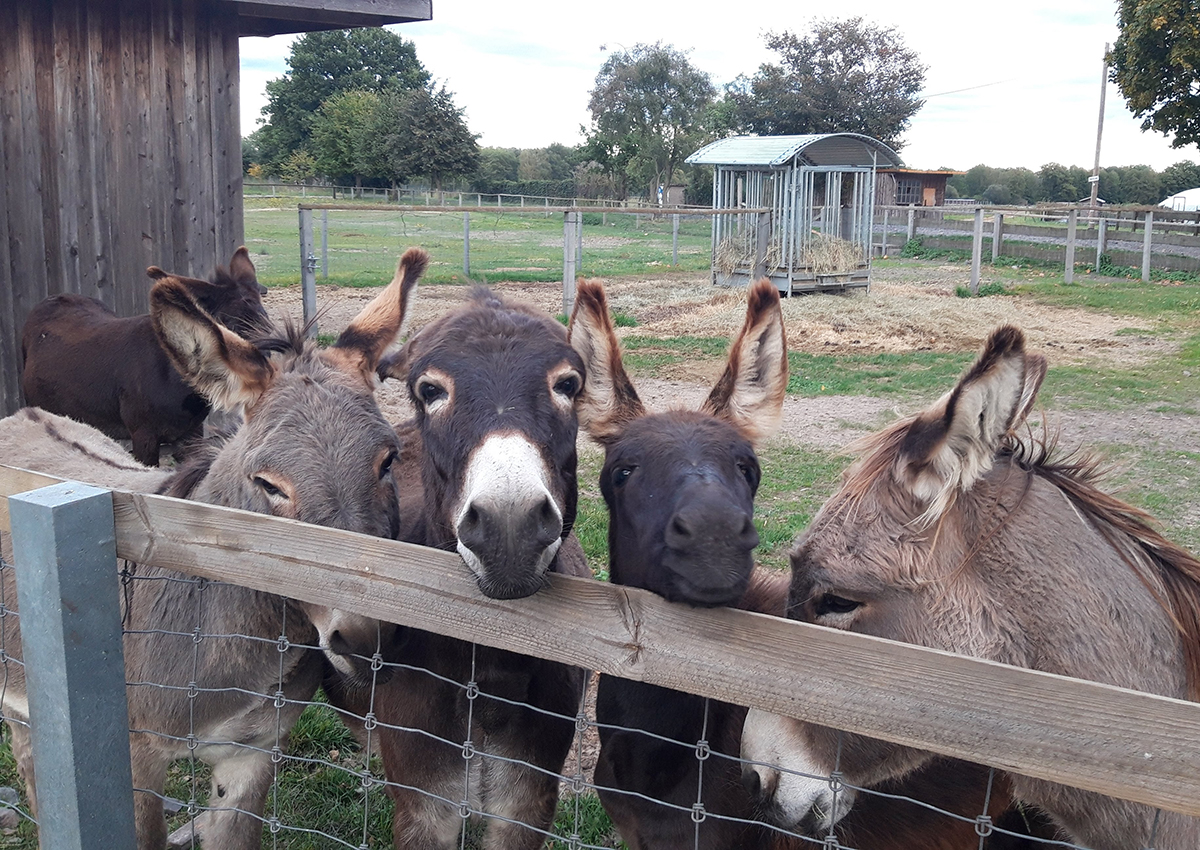 Unsere Esel mit Vaddern Schoko (groß, dunkelbraun mit weißer Schnauze), Muddern Maya (große graue Esel Dame) und die drei Rabauken Emil (kleiner brauner Esel mit weißer Schnauze, ganz der Papa), Willi (kleiner grauer Esel, ganz die Mama) sowie Nesthäkchen Egon (kleiner graubrauner Esel) gehören seit vielen Jahren ebenfalls zur Hofladenfamilie und lassen sich gerne auch durch eine kleine „Kraulmassage“ von Euch verwöhnen.